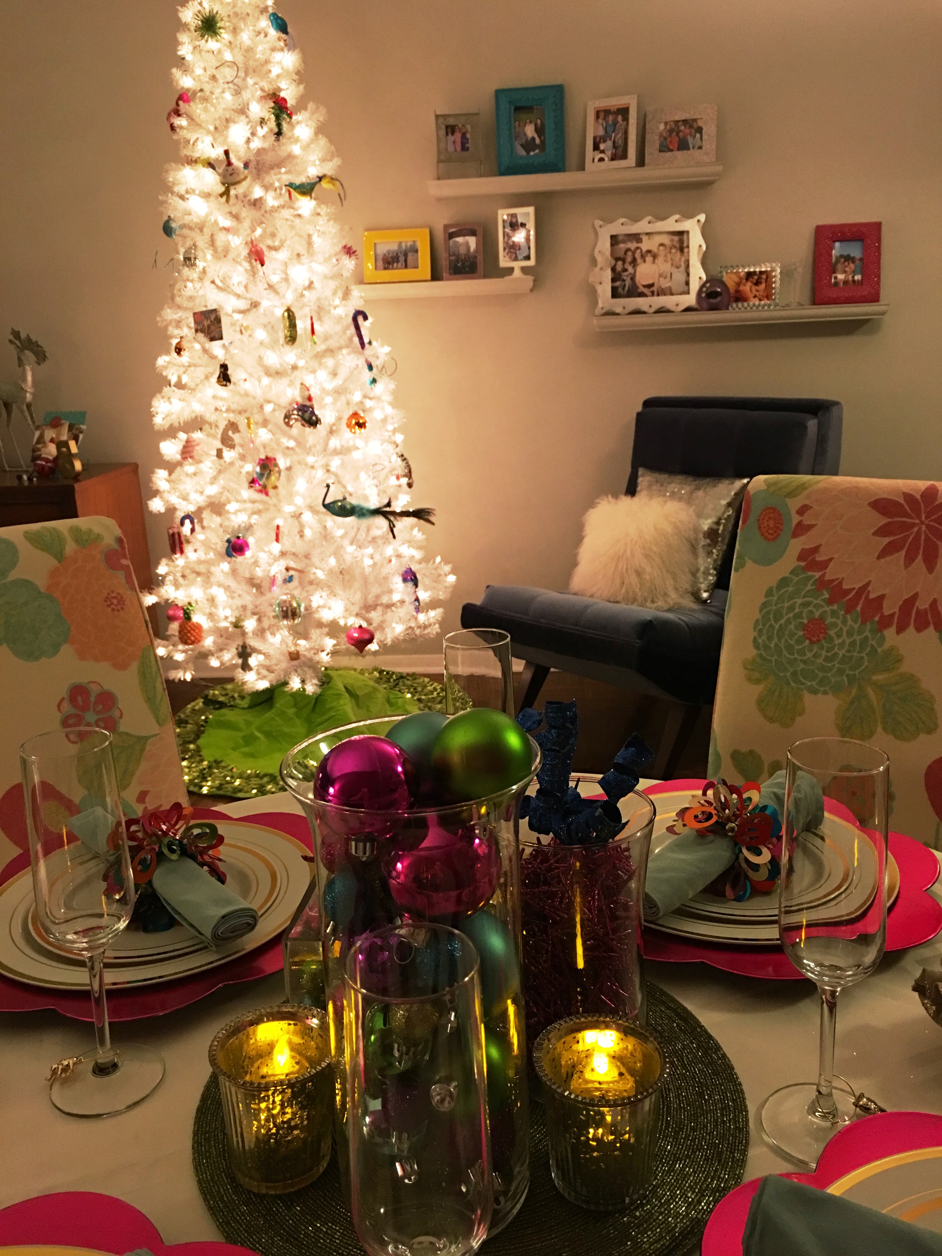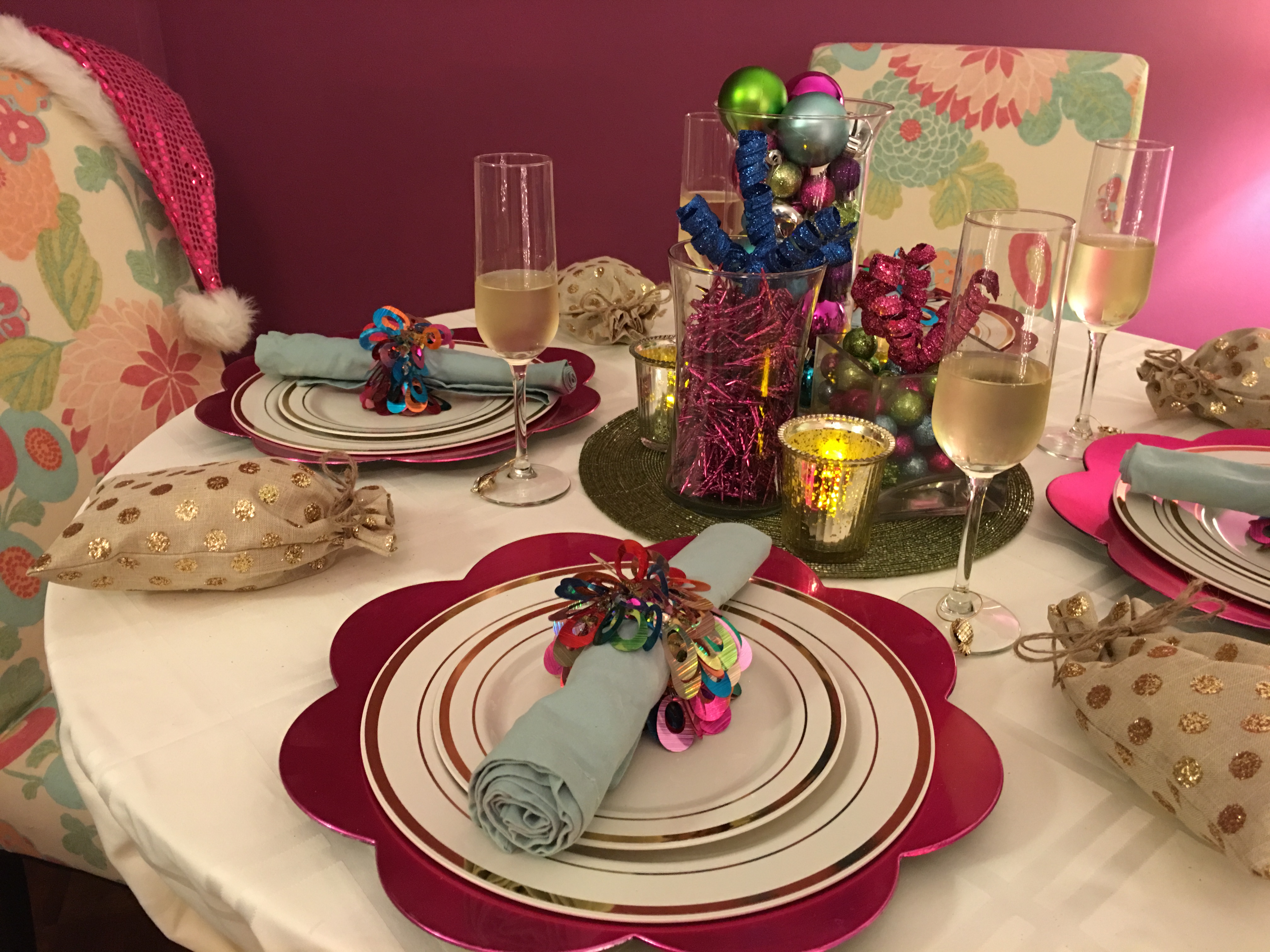 This table is designed for easy clean up! The plates are from a party store and can just be tossed when you are finished eating. They really do look like fine china though. The chargers are fun magenta flowers that I have had for years, and they go really well with my chairs and my Christmas bulbs, which I have incorporated into my centerpieces. Add coordinating cloth napkins, with whimsical napkin rings, and wah-lah, a pretty place setting. I added the little burlap bags with gold glitter polka-dots as my party favors. They just have little chocolates inside, but you could put anything you like in them. Always fun to send your guests away with a memento to remember your time together.