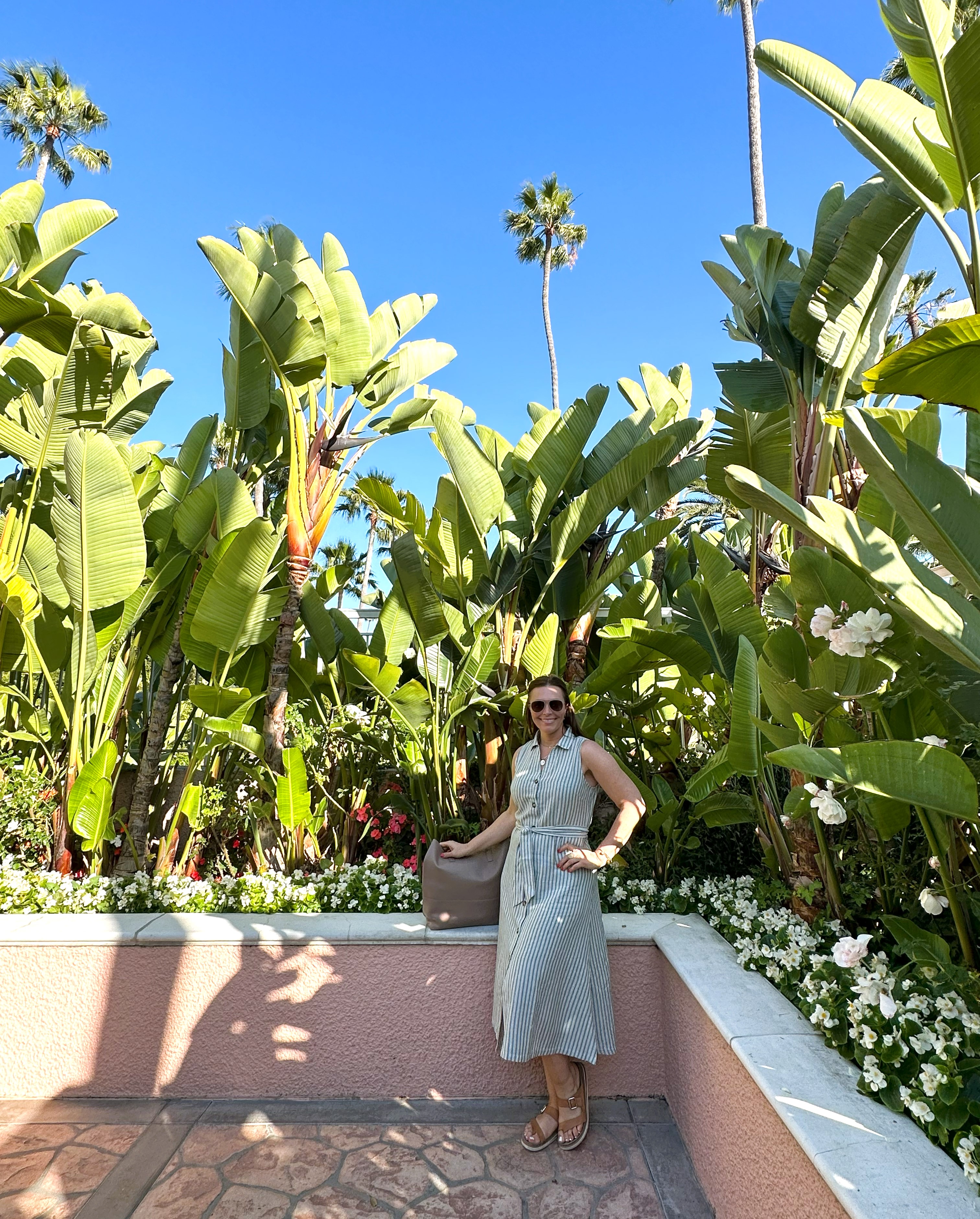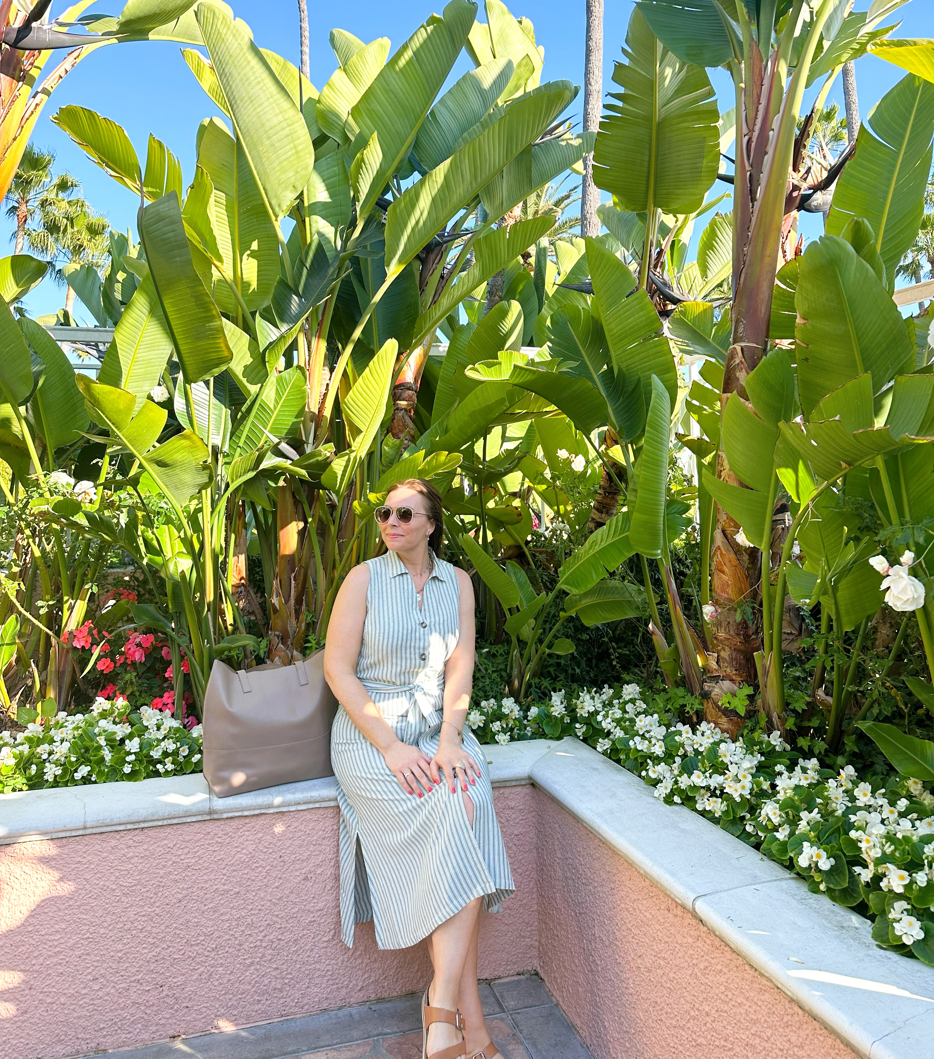 Dress: ABLE Leather Tote: ABLE Sandals: Mephisto Sunglasses: Loft