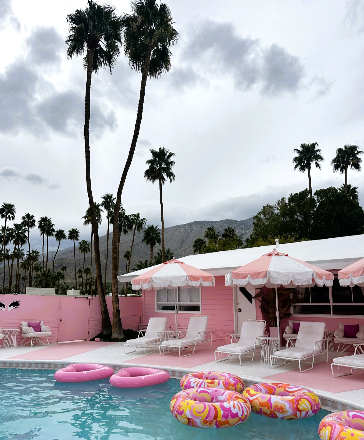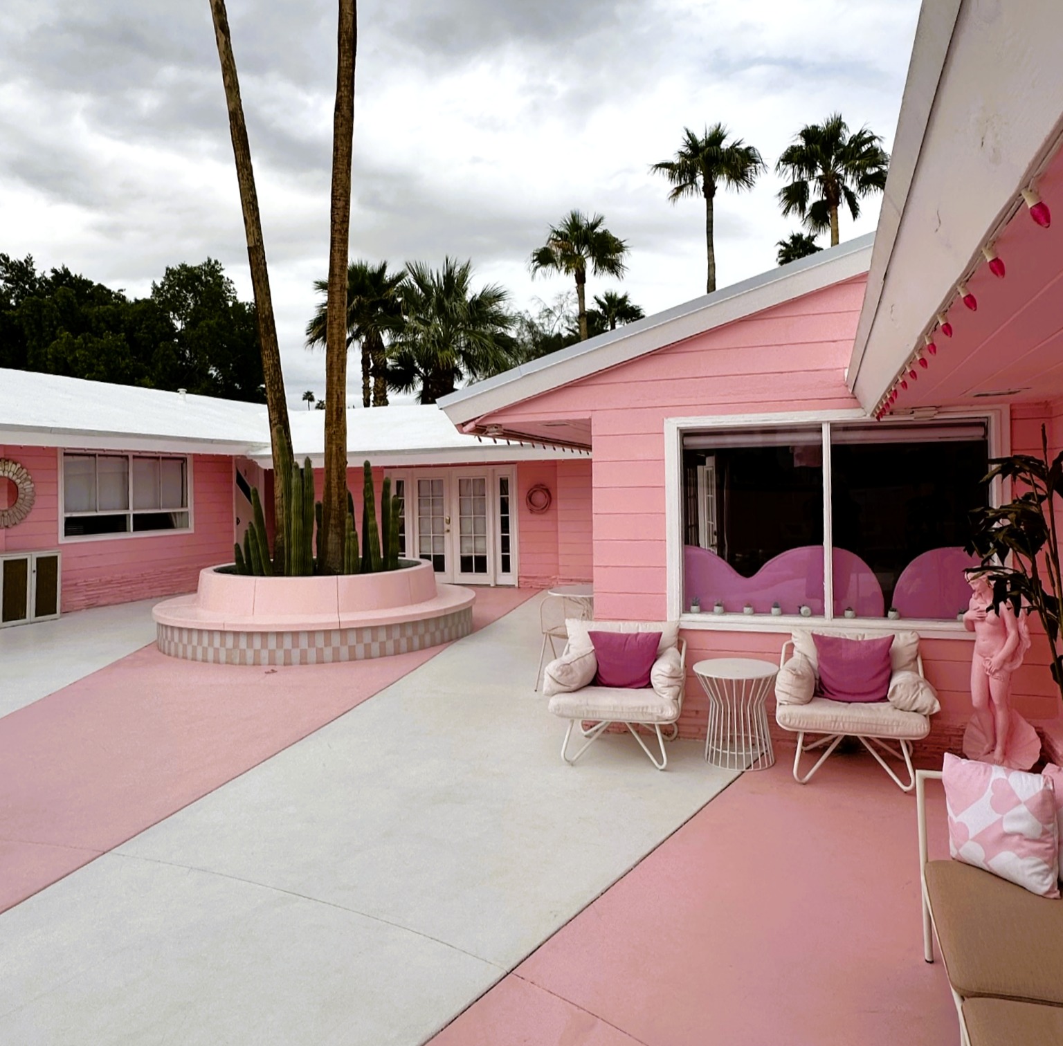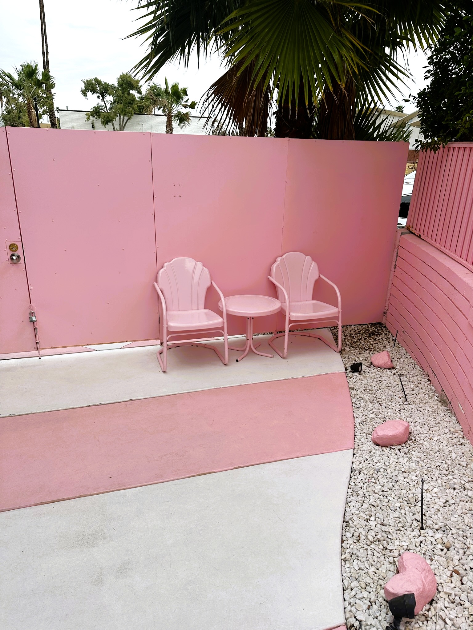 Pink in Palm Springs – it’s just the happiest color to transport you back in time, which is easy to do in this city. From the minute you drive in from the desert, Palm Springs feels like a nostalgic oasis. It oozes mid-century modern charm every which way you look. From the homes to the restaurants, the shops to the cars, and everything in between, you’ll feel like you stepped back in time. And while your fashion doesn’t have to have retro flair or even retro color, it’s a guarantee you’ll be surrounded by happy hues. Pink in Palm Springs is not a rarity. Neither is orange, green, blue, purple. The rainbow is all around you in Palm Springs – sometimes subtly, sometimes not so subtly. Pops of color jump out in many places, but one place decided a pop wasn’t enough.