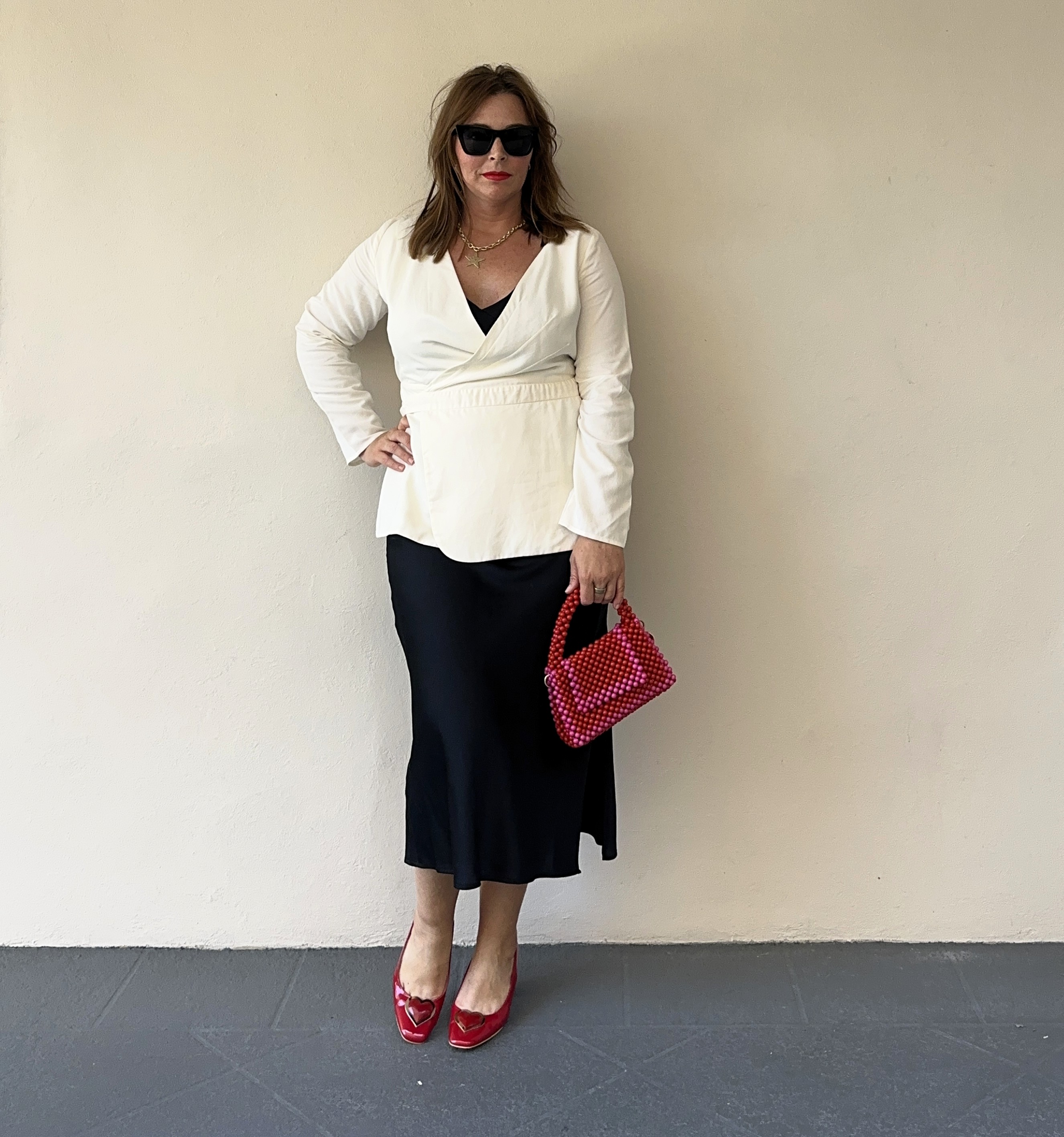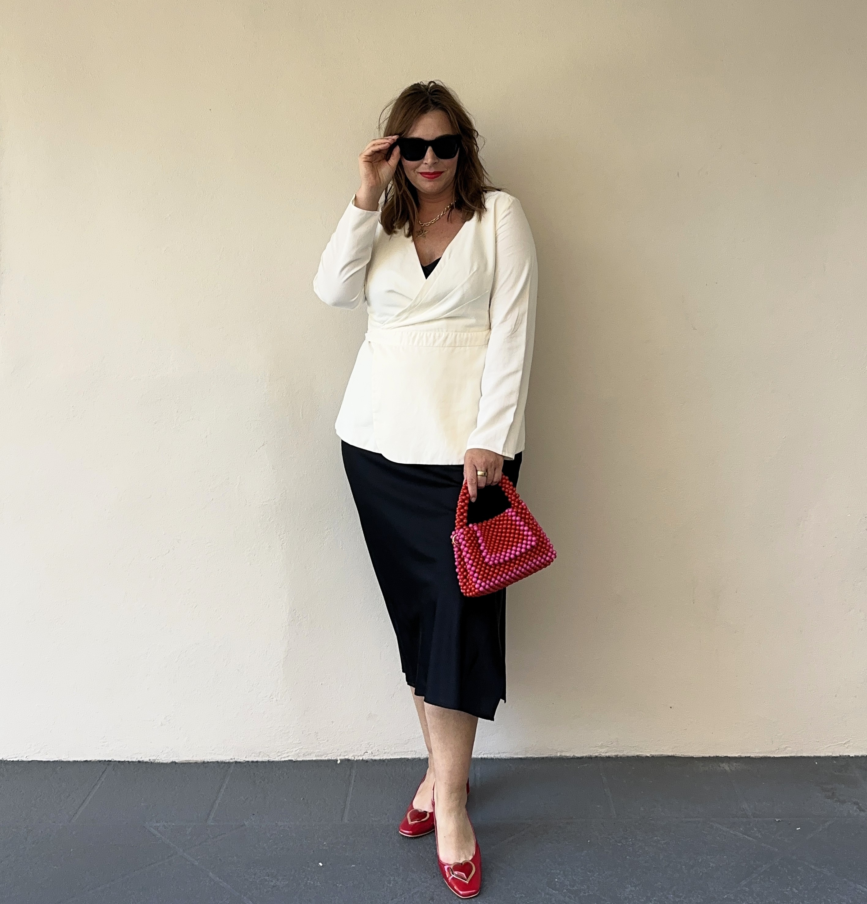 Here I have paired it with a denim blouse and cotton wrap. Both looks could be business appropriate for work. Both could be great to grab brunch or happy hour cocktails with friends. Both could be worn in any city around the globe. So, while yes, I may pack it, among it many, many other items, it will always make styling easier both at home and on the go. Whether you are like me hauling multiple suitcases on any trip, or packing as light as possible, a satin, spaghetti strap LBD is a must add to any closet. And here’s the best part – it doesn’t have to break the bank. I stumbled upon this one at Target – likely while was looking for the soap aisle – because, that’s how Target works.
